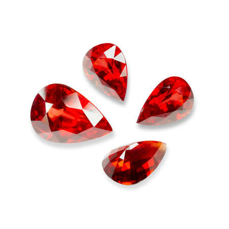 Variety of ruby cuts placed side-by-side oval, pear, cushion, emerald on soft cloth