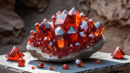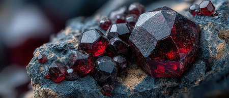 Gorgeous display of sparkling garnet crystals in vivid red color over a dark background, perfect for showcasing natural beauty and elegance in design.