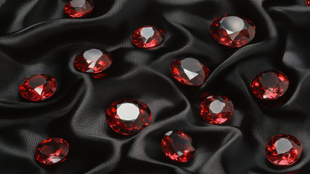 A stunning close-up of red gemstones showcases brilliant cuts and rich colors, perfect for projects related to luxury, elegance, and artistic designs.