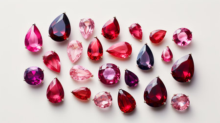 Glistening drops of various red and pink gemstones create a vibrant display, showcasing their exquisite shapes and hues, reflecting light beautifully against a soft, neutral backdrop.
