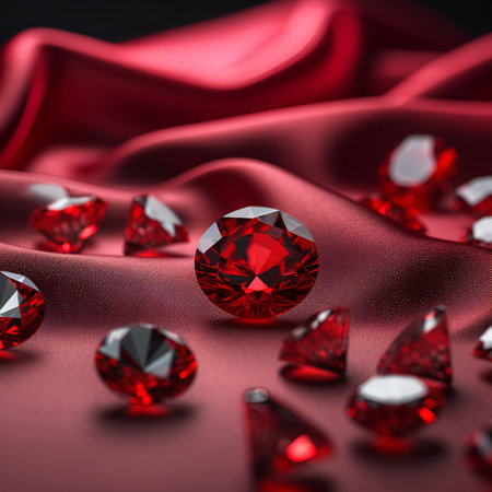 An AI generated illustration of sparkling diamond stones on a red satin fabric background