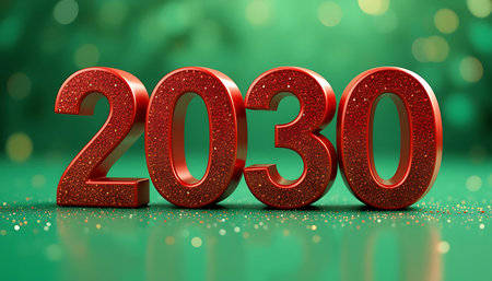 Happy New Year 2030 on green background. red numbers 2030 . red 3d 2030 text. Idea for holiday greetings, banner, social media, flyer. New Year events, and festive designs. bokeh background.
