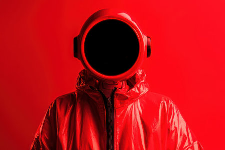 Astronaut floating in red liquid pool on red background, conceptual space exploration in uncharted territory