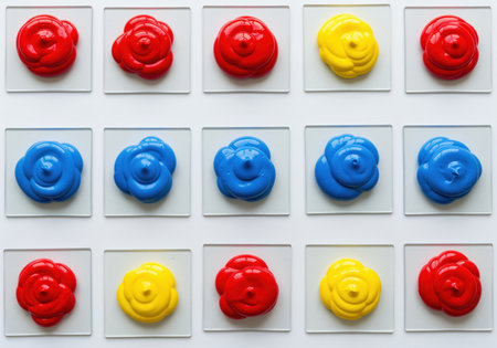 Thick, glossy blobs of red, blue, and yellow primary color paint arranged in a geometric grid pattern on small clear glass squares. perfect for art, creativity, and design concepts.