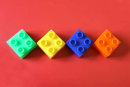Buildable colored plastic blocks to play, build and organize on a red background as a concept of inclusion, diversity and plurality
