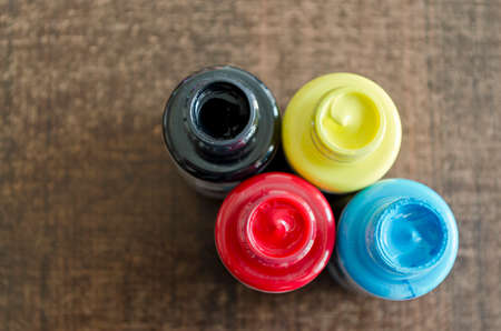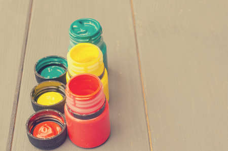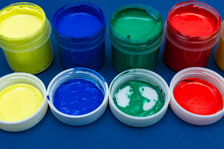 jars with gouache of different colors on Colored background. hobby painting. Top view with empty space. workplace for creativity. home teaching concept drawing.