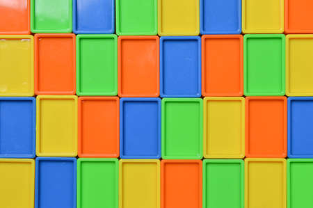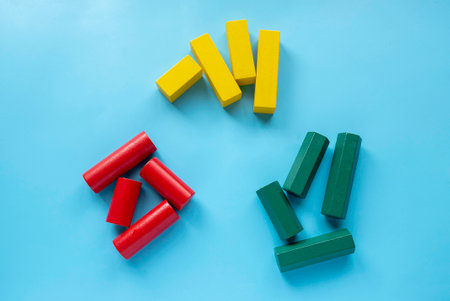 Abstract background. Texture with various colorful shapes of wooden blocks. Geometric shapes in different colors on a green background. The concept of creative, logical thinking or problem solving.