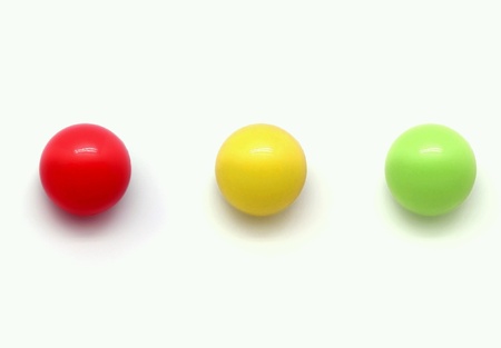 Green yellow and red round magnet in a row on a blue background in the form of a traffic light symbol. The concept of evaluation, satisfaction, status, and pass