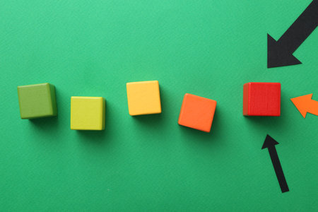 Maximum. Arrows pointing at colorful cubes on green background, flat lay