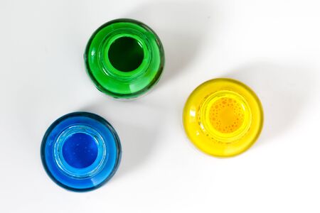 Glass bottle with acrylic green, blue and yellow paint on white background