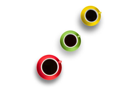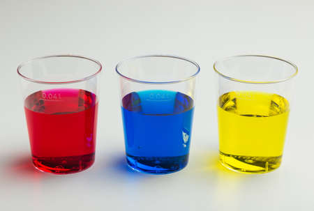 Red, yellow and Green beverages like traffic light colors inside the small shots on the blue background.