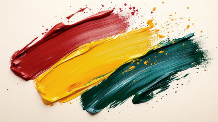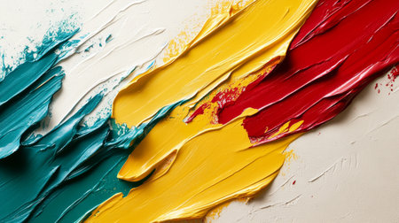 Bright red, yellow, and green paint strokes create a vibrant composition on a light background, showing artistic expression and creativity.