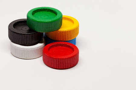 Multi-colored plastic bottle caps on a blue background. The problem of environmental pollution. Top view, Pattern. Recycling plastic.