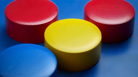 Four open paint cans filled with red, blue, and green paint arranged on a vibrant yellow background. A creative concept symbolizing art, design, and color theory.