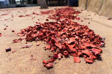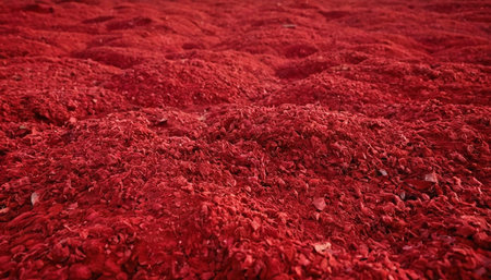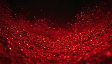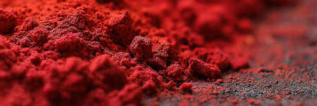 Exploring the rich texture of red sindoor powder, this macro shot highlights fine granules on a surface, creating a vibrant yet soft effect of color.