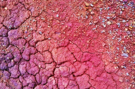 Travel to Ural, Russia. The view on the red and purple dry cracked soil for background.