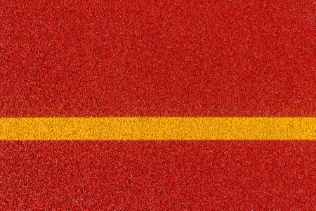 Single yellow line in running court athlete stadium, top view, rubber texture