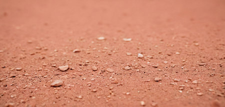 A close-up shot of red earth, resembling Martian terrain, with a small rock in the foreground and blurred mountains in the background, creating a sense of vastness and desolation.