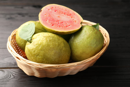 Fresh whole and cut guava fruits in wicker basket on black wooden table, closeup