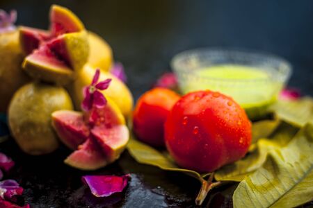 Best cheap face mask for tanned skin on wooden surface un a glass bowl consisting of guava leaves paste well mixed with some tomato pulp. Shot with entire ingredients with fantastic colors.