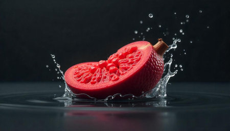 Vibrant Red Pomegranate Half Splashing in Water on Dark Surface