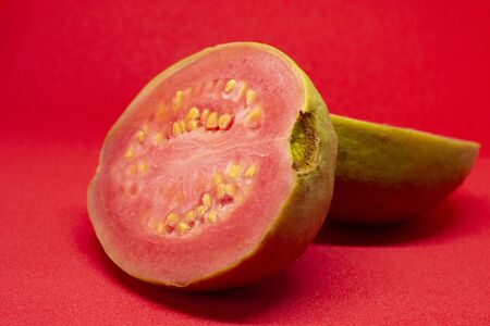 Guava fruits broken in half. Tropical fruits. Guavas in halves. Source of vitamin C. Fruit indicated for the immune system. antioxidant. Detox diet.