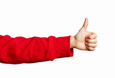 Isolated woman's hand in red sleeve giving thumbs-up gesture