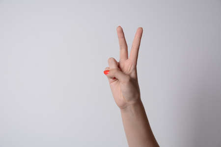 Woman raising two fingers up on hand it is shows peace strength fight or victory symbol and letter V in sign language on white background