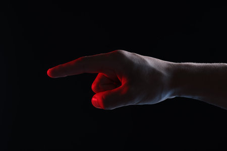 Red devil hand on dark , peace hand sign. Halloween or horror theme