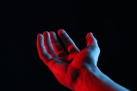 Female hand. mystical concept. Creative pop art pink blue neon color. Trendy gradient illumination. Night light