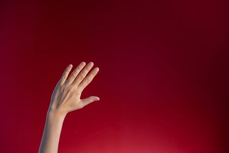Conceptual image and idea, human hand and finger gesture symbol on bright red background on empty space.