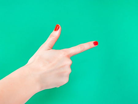 photo shot of victory sign of womens hand. Girl show two fingers.
