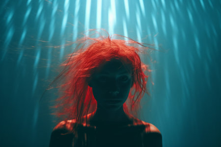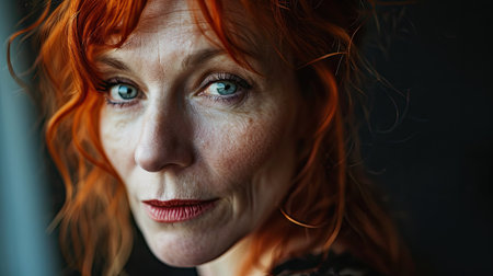 Striking red hair captures attention against a rich, matching backdrop, creating a mysterious and bold visual statement. Perfect for conveying passion and allure. Generated A.I.