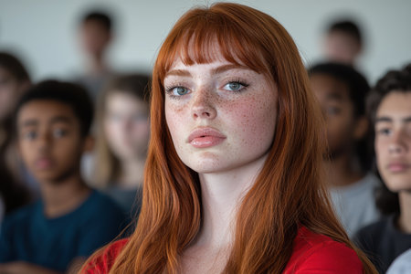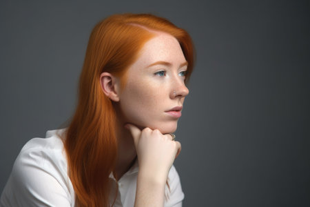 Young woman with wavy, shoulder length red hair and freckles gazes directly at camera, exuding confidence and charm. Her expression is calm and inviting, set against neutral background
