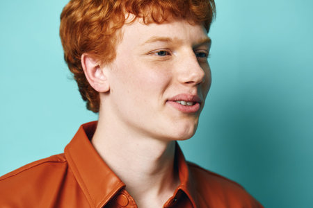 Young man with red hair and freckles wearing brown leather jacket smiling and looking sideways against blue background. Portrait, casual style and natural expression in studio lighting.