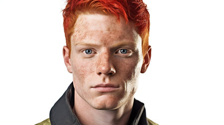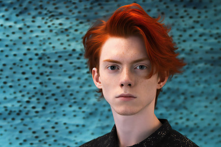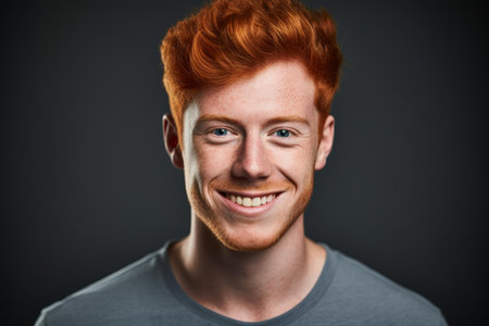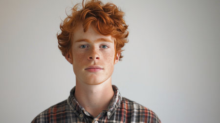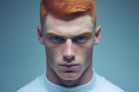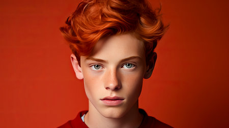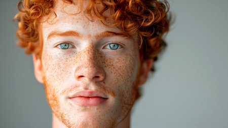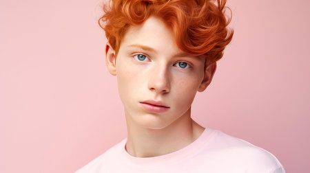 Young adult handsome red haired man portrait, nordic type male model with red hair and beard, studio shot, background with copy space, diversity and different beauty concept, AI generated