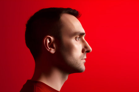 Portrait of young guy in white shirt standing with calm expression, looking at camera against red studio background