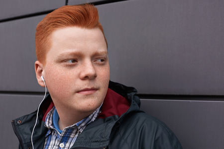 A close-up freckled redhead boy wearing in black jacket and checked shirt having earphones in his ears listening to the music while posing over black wall looking aside
