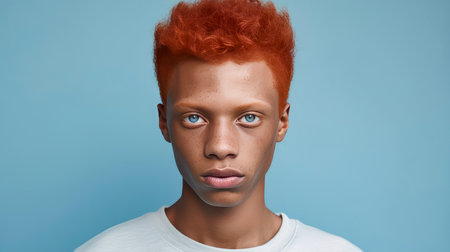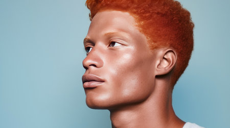Portrait of an elegant sexy smiling African man with dark, perfect skin, red hair, on a light blue background. Advertising of cosmetic products, spa treatments, shampoos and hair care products, dentistry and medicine, perfumes and cosmetology for men