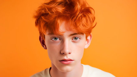 Portrait of a happy serious red-haired confident teenage guy with perfect skin, orange background, banner. Advertising of children's cosmetic products, shampoos and hair care products, medicine, perfumes, cosmetology, courses and trainings