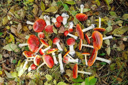 A lot of red fly agaric mushrooms or toadstool in the grass. Latin name is Amanita muscaria.