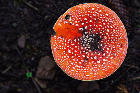 Top-down view of amanita mushroom cap in a Russian forest