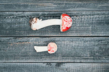 Red and white mushrooms on wooden surface. Concept of fungi, nature, forest, mycology.