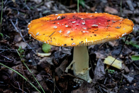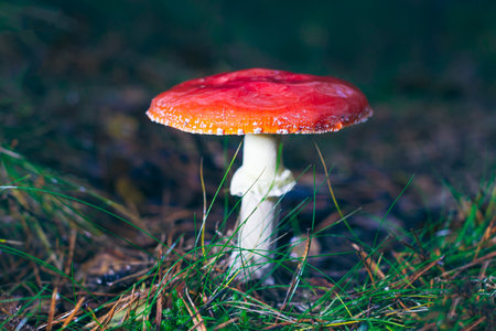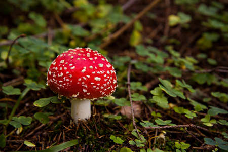 Detail of fly amanita poisonous mushroom growing on forest floor.