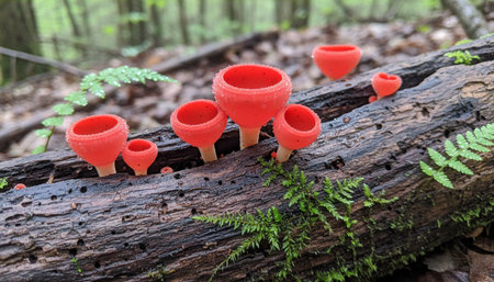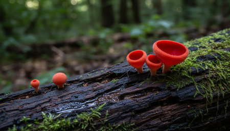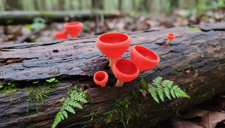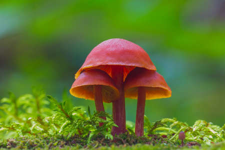 Orange mushroom ,Champagne mushroom or eyelash cup mushroom with sparkling droplets in the forest. Ecosystem or biological diversity concept.