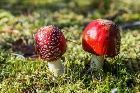 Amanita muscaria Macro photo. Concept of environment and nature of autumn forest in detail. Two red fly agaric poisonous and dangerous inedible mushrooms grow in autumn forest.