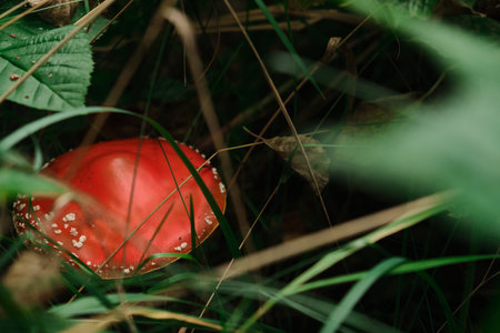 fly agaric mushroom poisonous grow in the forest among the grass
