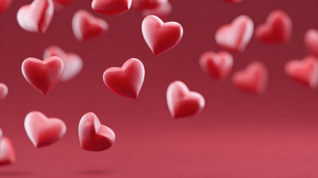 A captivating visual of 3D red hearts gently falling against a smooth red background. This image embodies romance and joy, perfect for themed events.