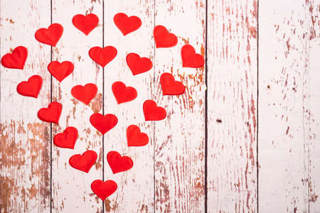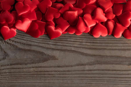 Valentine's day many red silk hearts on wooden background, love concept