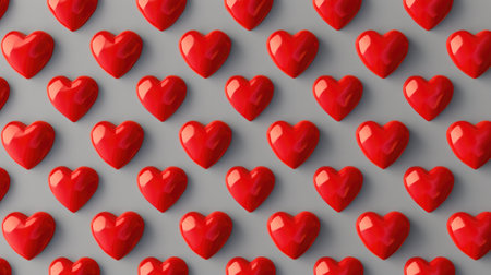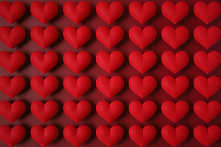 A romantic and graphic composition featuring a grid of plush red hearts against a pastel pink backdrop. Each heart casts a sharp shadow creating a sense of depth and pattern.